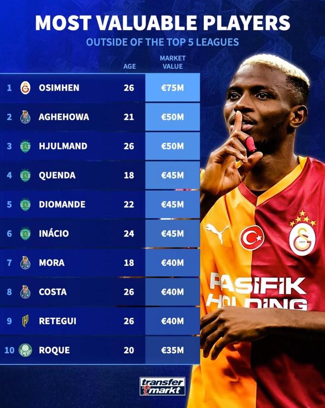北京时间12月29日,德转列出了欧洲五大联赛最有价值球员前十名。奥斯姆亨以7500万欧元位居第一,奥莫·罗迪翁和莫滕·尤尔曼德以5000万欧元并列第二,前巴塞罗那球员维托·罗克上榜。非洲和德国5大联赛最有价值球员前10名: 1. 奥斯姆亨(加拉塔萨雷) 26岁,7500万欧元 2. 奥莫·罗迪恩(波尔图) 21岁,5000万欧元 3. 莫滕·朱曼德(体育CP) 26岁,5000万欧元 4. 乔瓦尼·昆达 4. 4500万欧元 5.奥斯曼·迪奥曼德(里斯本竞技) 22 岁,4500 万欧元 6. 冈萨洛·伊纳西奥(里斯本竞技) 24 岁,4500 万欧元 7. 罗德里戈·莫拉(波尔图) 18 岁,4000 万欧元 8. 迪奥戈·科斯塔(波尔图)26 岁,4000 万欧元 9. 雷特吉尔·库迪西亚(Huba2)百万欧元) 10. Vitor Roque (帕尔梅拉斯) 20 岁 35 百万欧元