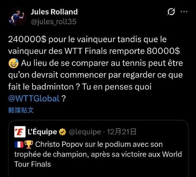 12月21日,乒乓球运动员朱尔斯·罗兰在社交媒体发文表示,他对奖金并不满意:BWF奖金为24万美元,而WTT只有8万美元。朱尔·罗兰:BWF总决赛冠军的奖金为24万美元,而WTT总决赛冠军只能获得8万美元。相比于网球,也许我们应该先看看羽毛球的奖金?您对WTT有何看法?本届WTT香港总决赛单打冠军将获得8万美元奖金,混双冠军组合将获得1.4万美元奖金。此外,所有获得WTT香港2025年总决赛参赛资格的选手将根据其单打和混双种子排名获得等比例的额外奖金。因此,除了主要奖金外:女单2号种子王曼昱额外获得23500美元,男单5号种子张本智和额外获得13500美元。 Jules Rolland,男,20岁出生于法国00岁,是法国乒乓球运动员,世界最高排名第64位。 2025年7月26日,在拉各斯举行的2025年WTT常规挑战赛男双决赛中,诺德雷斯特/罗兰以0-3不敌纳纳塞卡兰/帕尔,获得亚军。