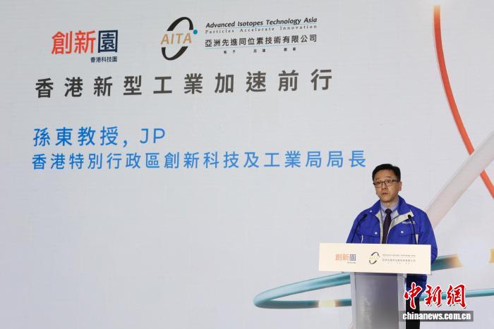 10月14日,香港科技园公司与亚洲先进同位素科技有限公司。图为香港特区政府创新科技及工业局局长孙东先生致辞。 (香港特别行政区政府D有效证件照片信息部)