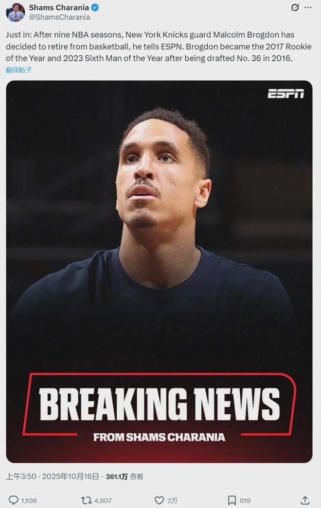 有时候,NBA并没有对球队有最终决定权,球员也可以掌控自己的命运。例如,“我不会再为你服务,即使我服务了也无法履行合同”。今天我要给大家介绍一个特别精彩的人物:布罗格登。 NBA新赛季即将开始,美国篮球传奇人物沙姆斯却给出了一个令人惊讶的消息:布罗格登已经决定退役。 2016年NBA选秀,马尔科姆·布罗格登在第二轮第36顺位被雄鹿队选中。事实上,布罗格登的实力很强。新秀赛季他是雄鹿队的关键轮换球员,场均贡献10.2分2.8篮板4.2助攻1.1抢断,并当选年度最佳新秀。为什么第二轮会选中这么强的选手呢?因为布罗格登参加选秀时已经24岁了。他是一个年龄较大的新人,具有即战能力。雄鹿并不认为布罗格登是一个需要精心训练的球员。他是一个便宜又方便的人层,但他们不想给他一份大合同。无奈之下,布罗格登迅速转会至步行者队,并在步行者队迎来了巅峰期。巅峰时期的布罗格登场均贡献21.2分、5.3个篮板和5.9次助攻。他是哈利伯顿之前的哈利伯顿,并成为步行者队的关键成员。但最终,他成为了NBA第一球员,并赢得了凯尔特人队的认可。在波士顿仅仅一个赛季,布罗格登就以 14.9 分、4.2 个篮板和 3.7 次助攻当选年度最佳第六人。这是他职业生涯的第二个奖项,但这也是他衰落的开始。随着布罗格登的伤病不断加重,他很快就被凯尔特人队抛弃,这使得前者转会到了开拓者队和奇才队,他也成为了一名普通的轮换球员。布罗格登想要一份大合同,但他并不认为今年夏天球员市场的环境会很艰难。他到处询问也没有得到。布罗格登曾经想加入在勇士队等了很长时间,但是勇士队还没有解决库明加的问题。最终布罗格登放弃了与勇士队的口头协议,转投尼克斯队,并签下了一份底薪合同,瞄准明年的自由球员市场。结果,在季前赛试训之后,布罗格登突然觉得自己的NBA生涯结束了,不想打比赛了。于是昨天,布罗格登宣布退役,尼克斯队也裁掉了他。 “我发现我似乎失去了战斗精神和对篮球的渴望,我没有前进的动力,”布罗格登说。那我只能祝福这位老将了。对了,韦斯特大师已经和国王签约了,剩下的后卫就只有本西蒙斯了。