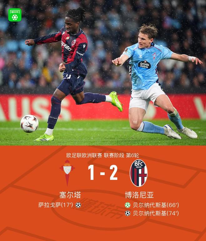 北京时间12月12日,欧国联阶段第六轮比赛打响,塞尔塔队迎战博洛尼亚队。上半场斯韦博格送出助攻,萨拉戈萨进球帮助球队取得领先。下半场,贝尔纳代斯基主罚点球,帮助博洛尼亚扳平比分。随后的比赛中,坎比亚吉助攻贝尔纳代斯基再进一球,完成了自己本场比赛的第二个进球。最终,博洛尼亚客场2-1逆转塞尔塔。主赛事第17分钟,斯韦德伯格倒三角传球,萨拉戈萨推射破门,塞尔塔1-0。第66分钟,波贝补分,贝尔纳代斯基主罚点球,博洛尼亚1-1塞尔塔。第74分钟,比亚吉助攻,贝尔纳代斯基破门完成双球,博洛尼亚2-1。双方球员在激动人心的时刻入场。比赛第17分钟,斯韦德伯格倒三角传球,推射破门,萨拉戈萨破门,第二节塞尔塔1-0。第7分钟,后卫禁球失误,乔纳森·罗的射门稍稍偏出。第42分钟,贝尔纳代斯基传球,卡斯特罗射门被拉杜挡出。第60分钟,贝尔纳代斯基出线,挡出波贝加的球门。第66分钟,判罚无效后,波贝再添一分,贝尔纳代斯基主罚点球。博洛尼亚1-1塞尔塔。第74分钟,坎比亚吉助攻,贝尔纳代斯基破门完成双射。博洛尼亚 2-1 球队阵容技术统计